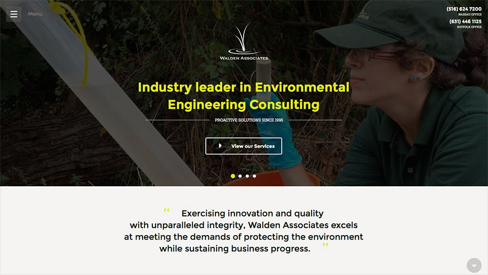 Walden Associates is a full service environmental consulting firm headquartered in Oyster Bay, New York providing consulting to both public and private firms. Immediately upon landing on the new website you’ll notice the powerful impact of a vibrant color palette and bold lettering. An arrow on the bottom left hand corner allows you to move all the way up or down the web pages effortlessly. A top left hand corner menu expands into view upon clicking, allowing the website to remain super clean and unobstructed. Fullscreen design, custom illustrations and icon work were also incorporated along with HTML5 movement to give this brand a truly unique look and feel. The final product is a website we are extremely proud of.